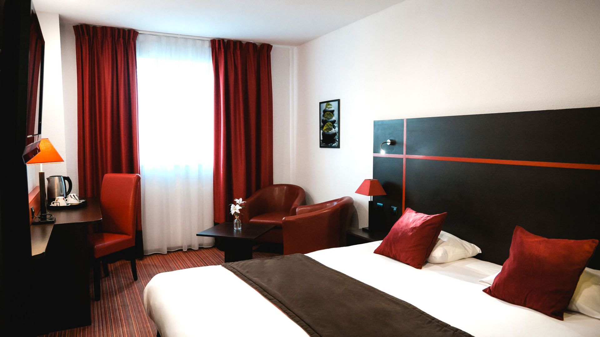 45 chambres d’hôtel climatisées et équipées de larges écrans plats de 80 cm.